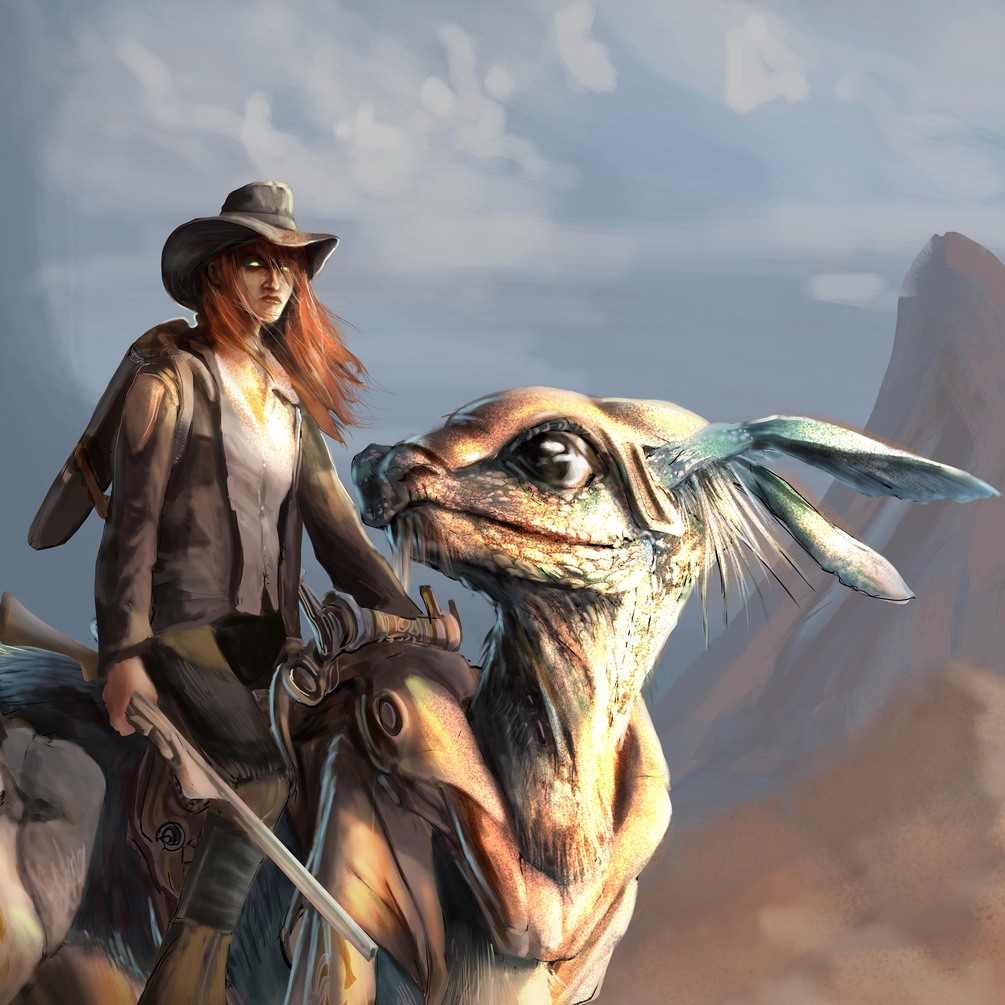 This project started out with the idea of combining the animals around our house: a leopard gecko, couple of cats and rabbits (couldn't fit the Koi, chickens and parakeets in this one) into one creature. After a few sketches I came up with this weird west, alien, sci-fi comp. I'm a big fan of the Joss Whedon 'Firefly' series and I wanted this to feel like it could fit into that world somehow even though there were never any aliens on the series.